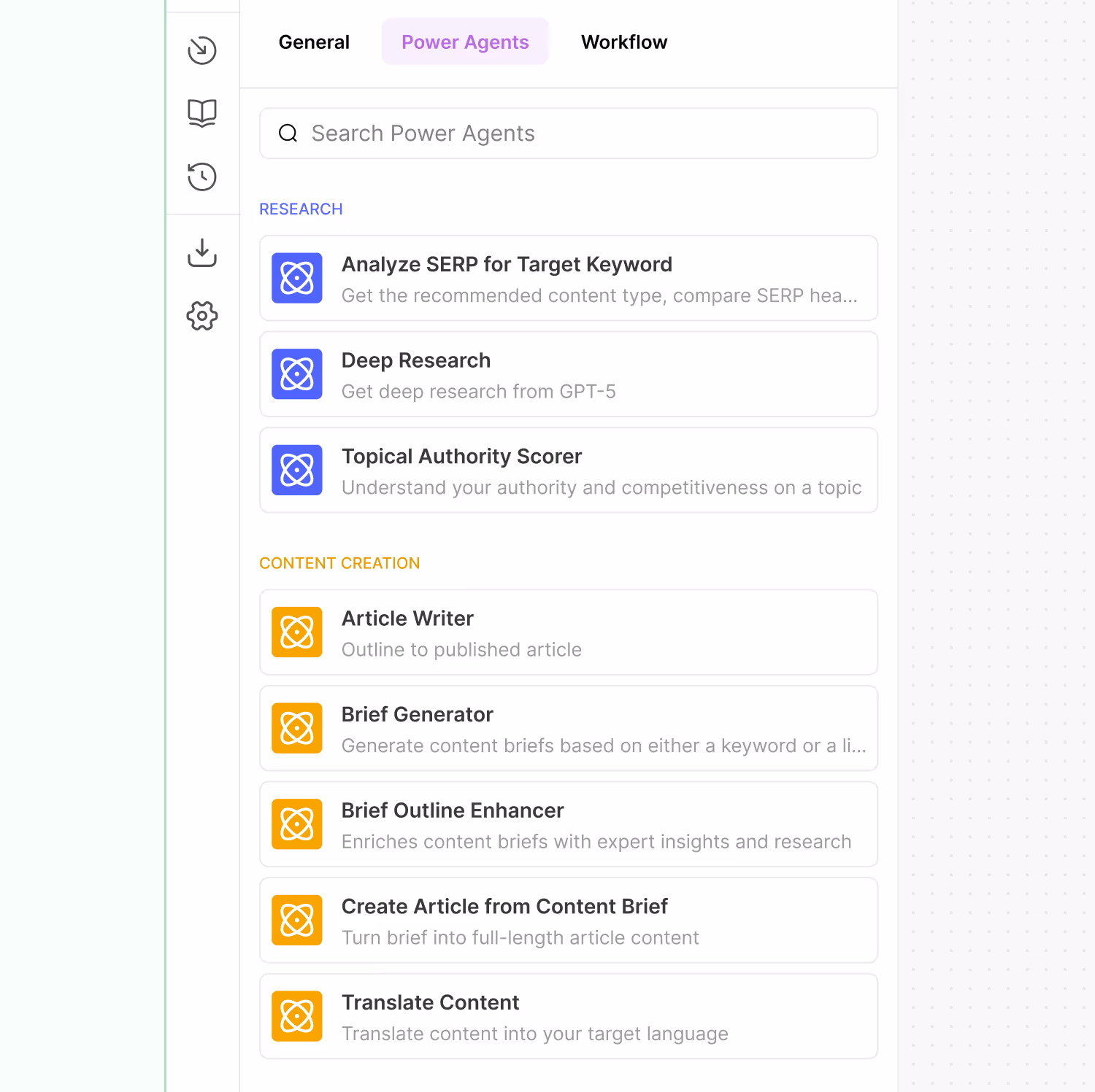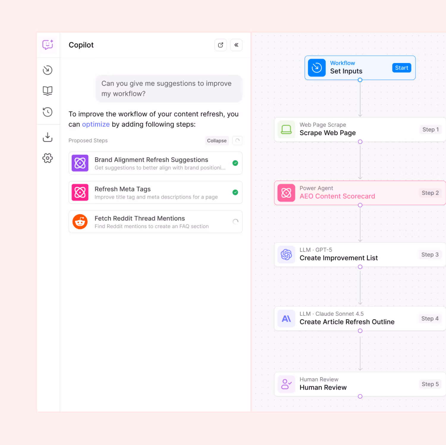 Build precision content workflows that turn your big ideas into impactful reality. Combine live data sources, brand-specific Knowledge Bases and Human Review steps. Fork and extend a growing library of Power Agents to race ahead.