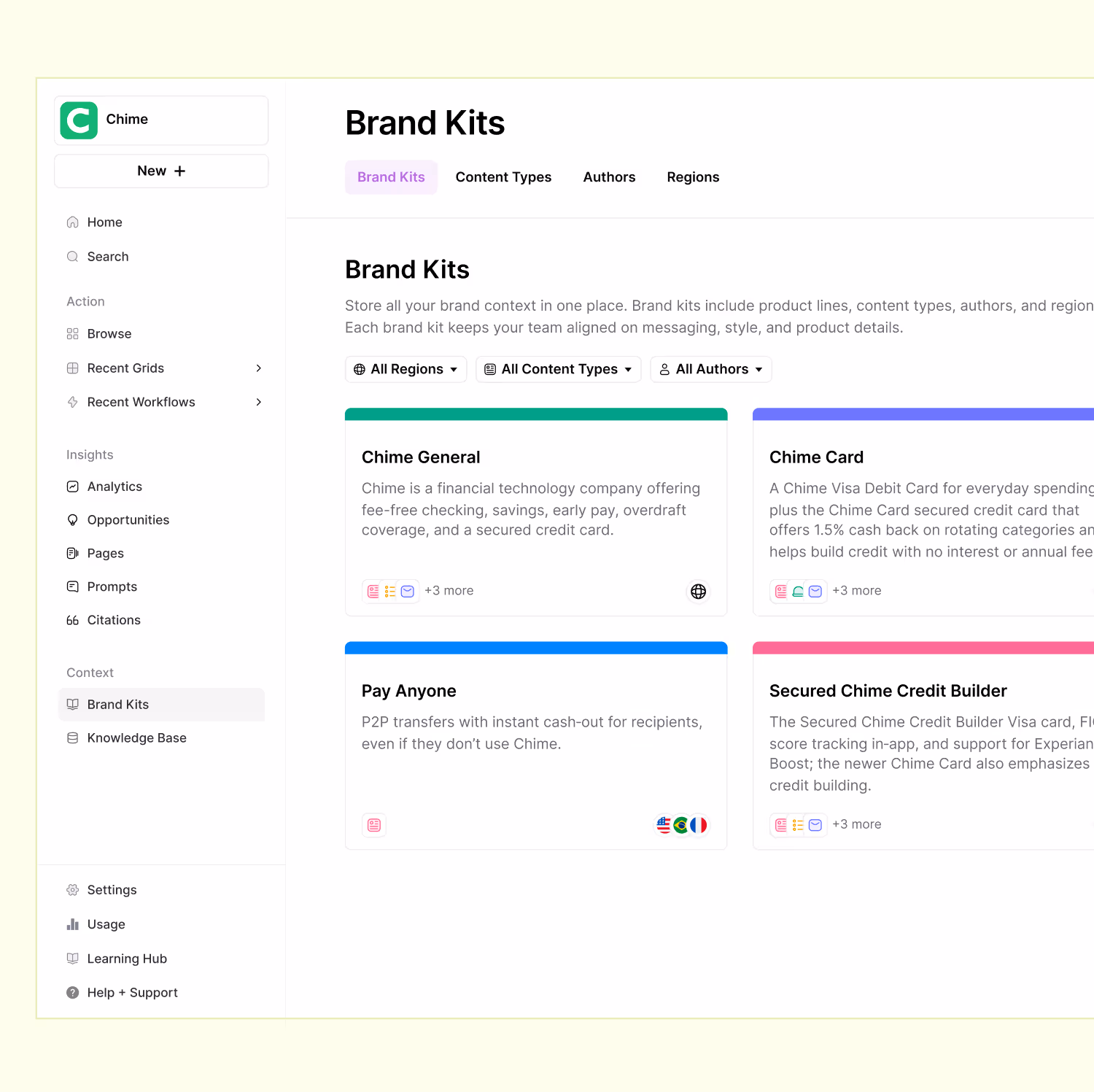Collect your tone, rules, references, and context in one home - giving teams the foundation to create content that feels true to the brand every time.