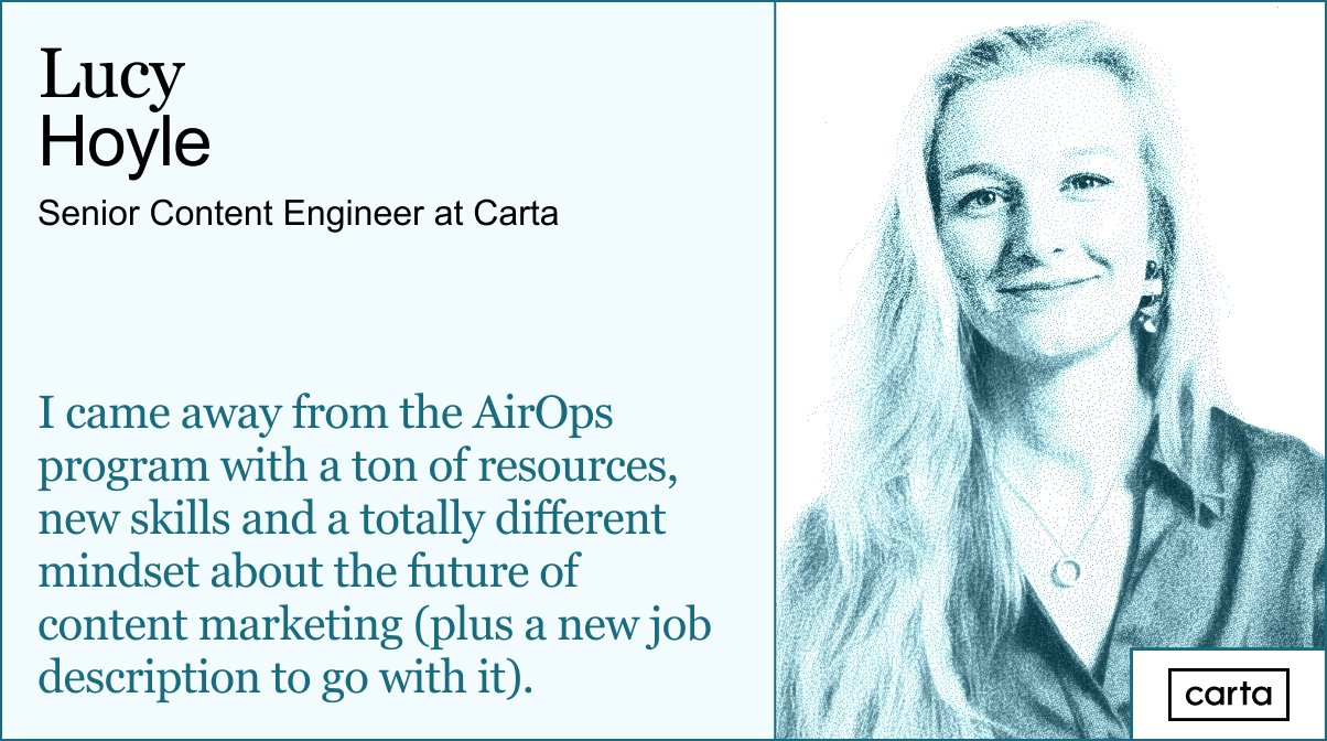 Lucy went through cohort and immediately updated her title. Not "Content Marketing Manager." Not "Senior Content Strategist." Lucy was a "Senior Content Engineer." The market recognized what she'd become before most companies even knew the role existed and is now recognized by her CMO Nicole Baer for advancing her AI skills with AirOps.