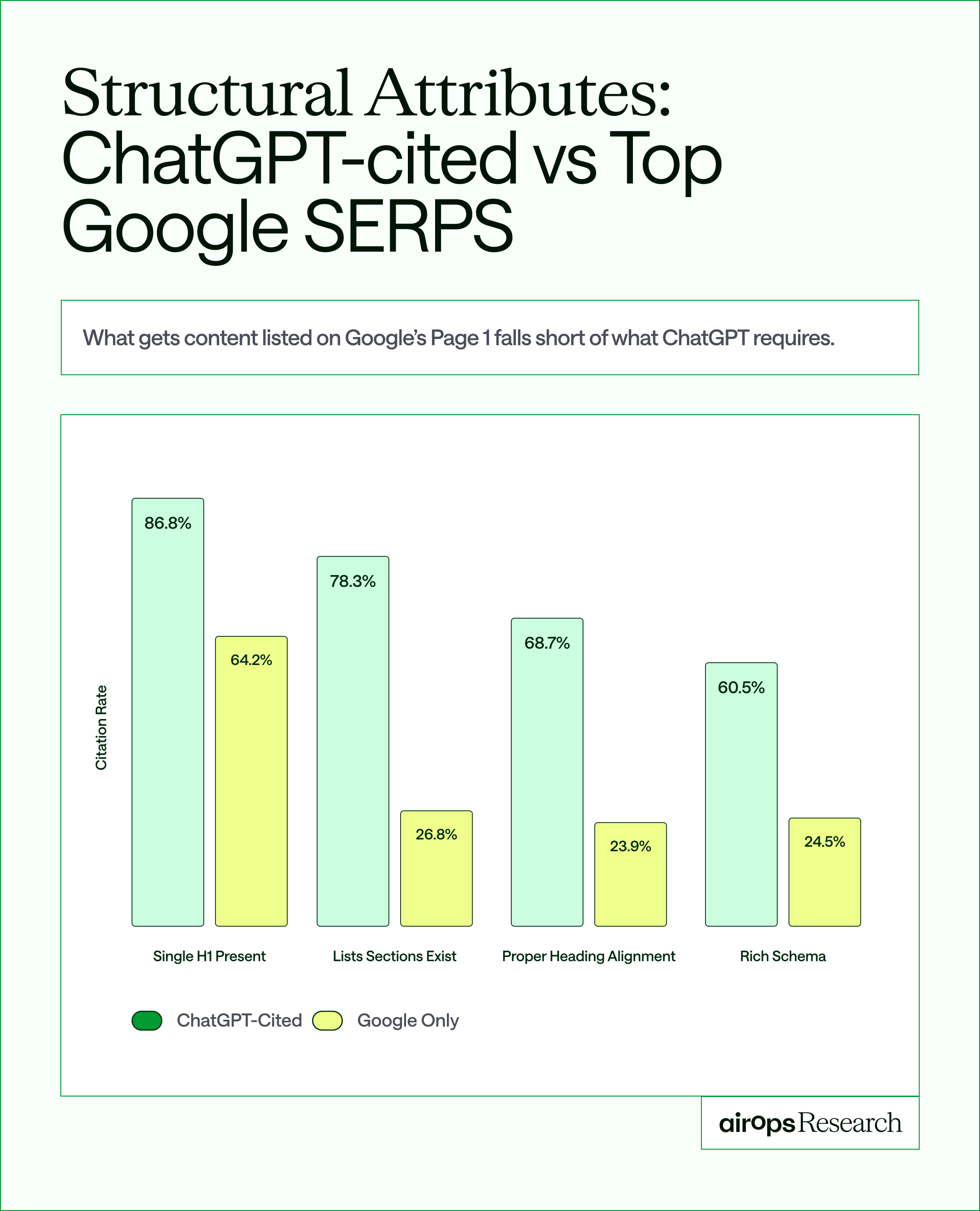 In AirOps analysis, pages with clean heading hierarchy and aligned schema earned 2.8× higher AI citation rates than poorly structured pages, showing that structure is a retrieval signal. When structure makes intent obvious, answer engines can extract and quote content with higher confidence.