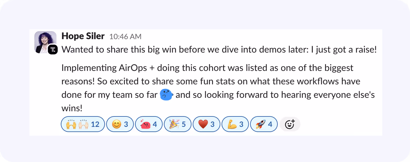 - Erik (Senior SEO Manager) built a content review system that handles 60-70% of what he used to do manually, saving 5+ hours per piece.