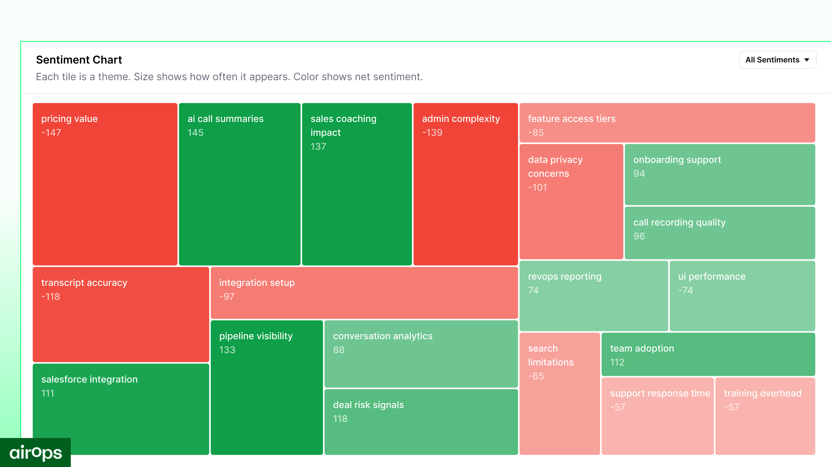 The Sentiment Tracking in AirOps goes further. It surfaces the specific themes shaping how AI engines characterize your brand, and connects those themes back to the pages behind them. So instead of knowing that sentiment is "71 and trending down," you know that "limited documentation" is a recurring negative theme, and you can see exactly which pages are being retrieved when AI engines generate answers that include that framing.