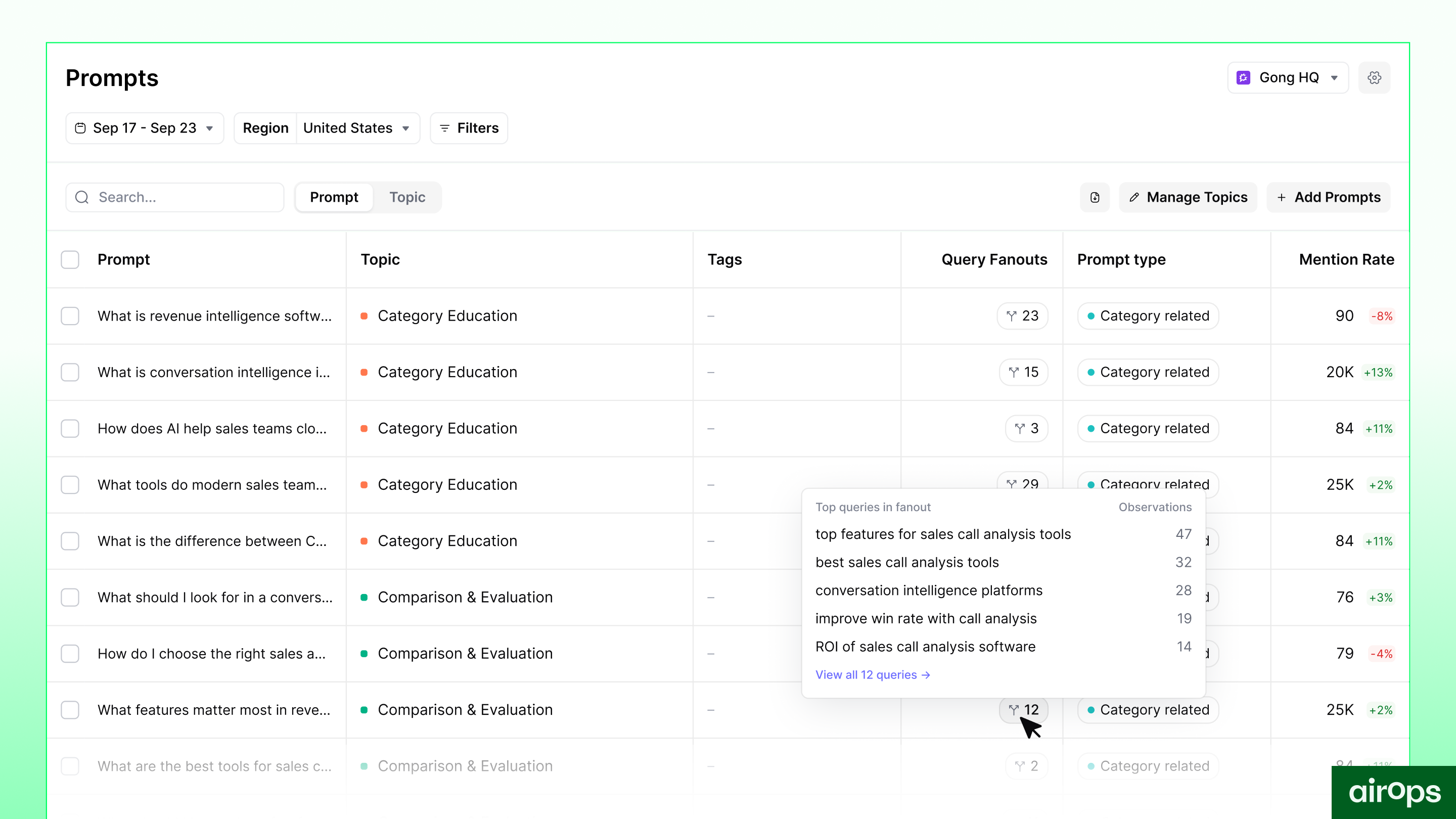 Today we're launching two features that close that gap. In AirOps Insights, you’ll now find the Sentiment Tracking, which surfaces the positive and negative themes in AI Search responses about your brand and the specific pages that shape them. Additionally, Query Fan-outs show the exact searches AI runs behind the scenes when it collects information to inform it’s responses.