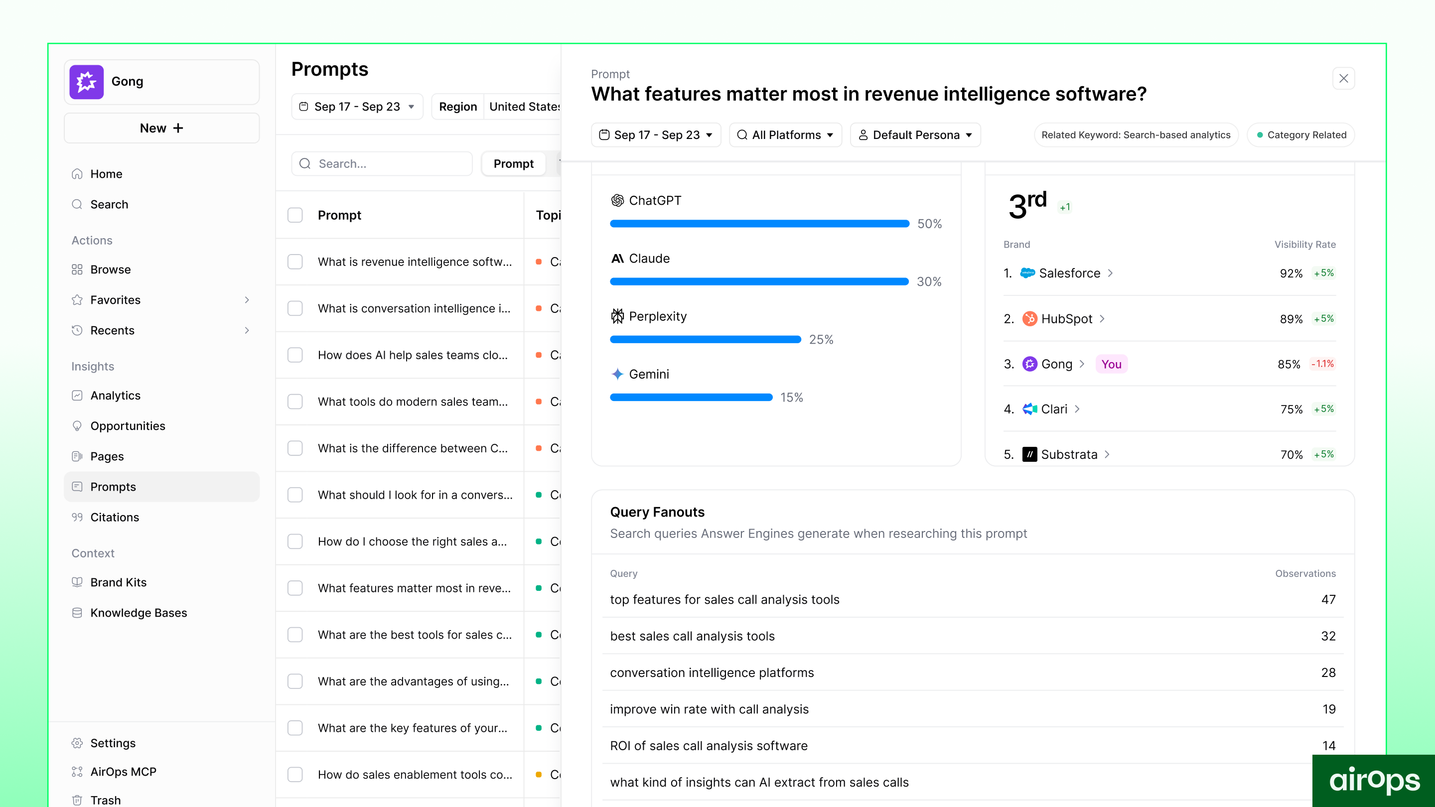 Both features are live in AirOps Insights. Sentiment data, including themes and source pages, is available across all platforms in your tracking set. Query Fan-outs are visible at the prompt level in the Prompts tab.