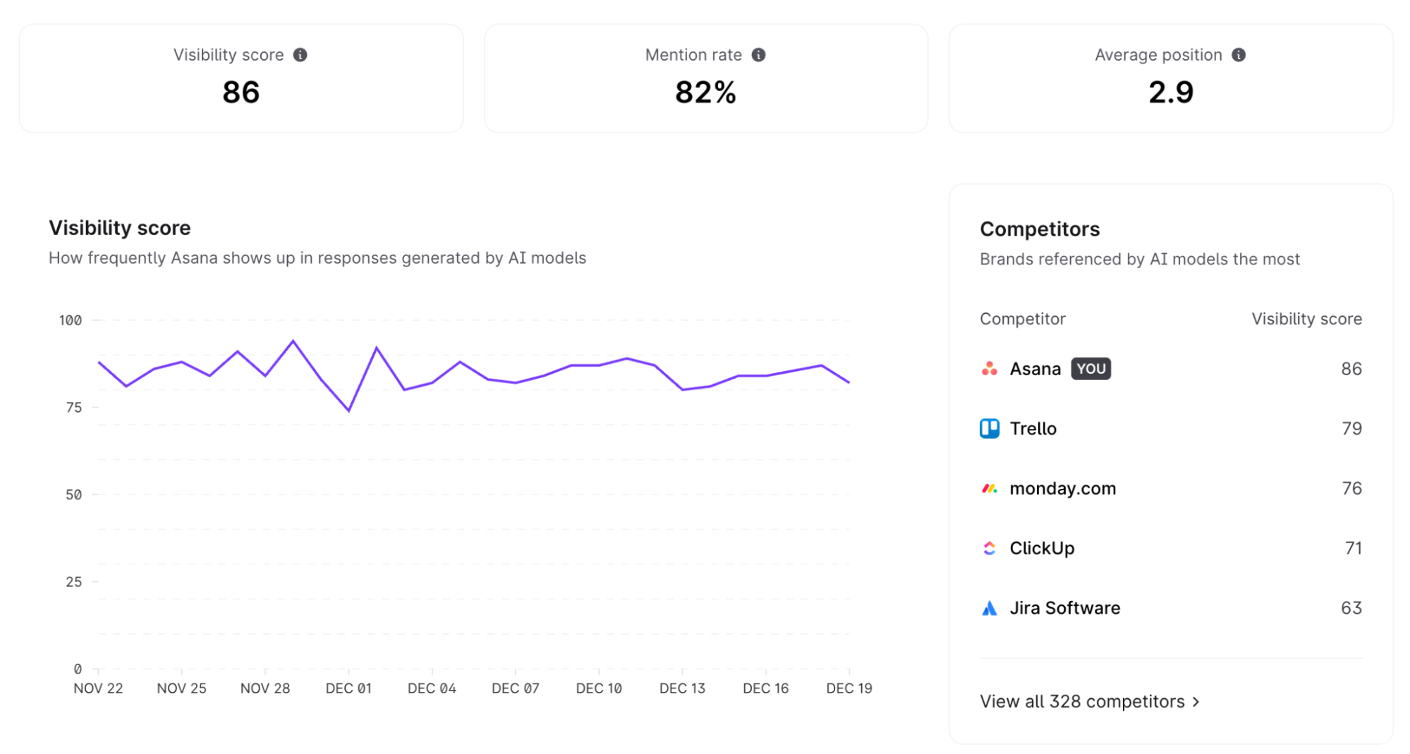 Competitor views show which brands AI prefers for the same queries. If competitors earn citations where you do not, that gap usually traces back to structure, clarity, or missing coverage—not just authority.