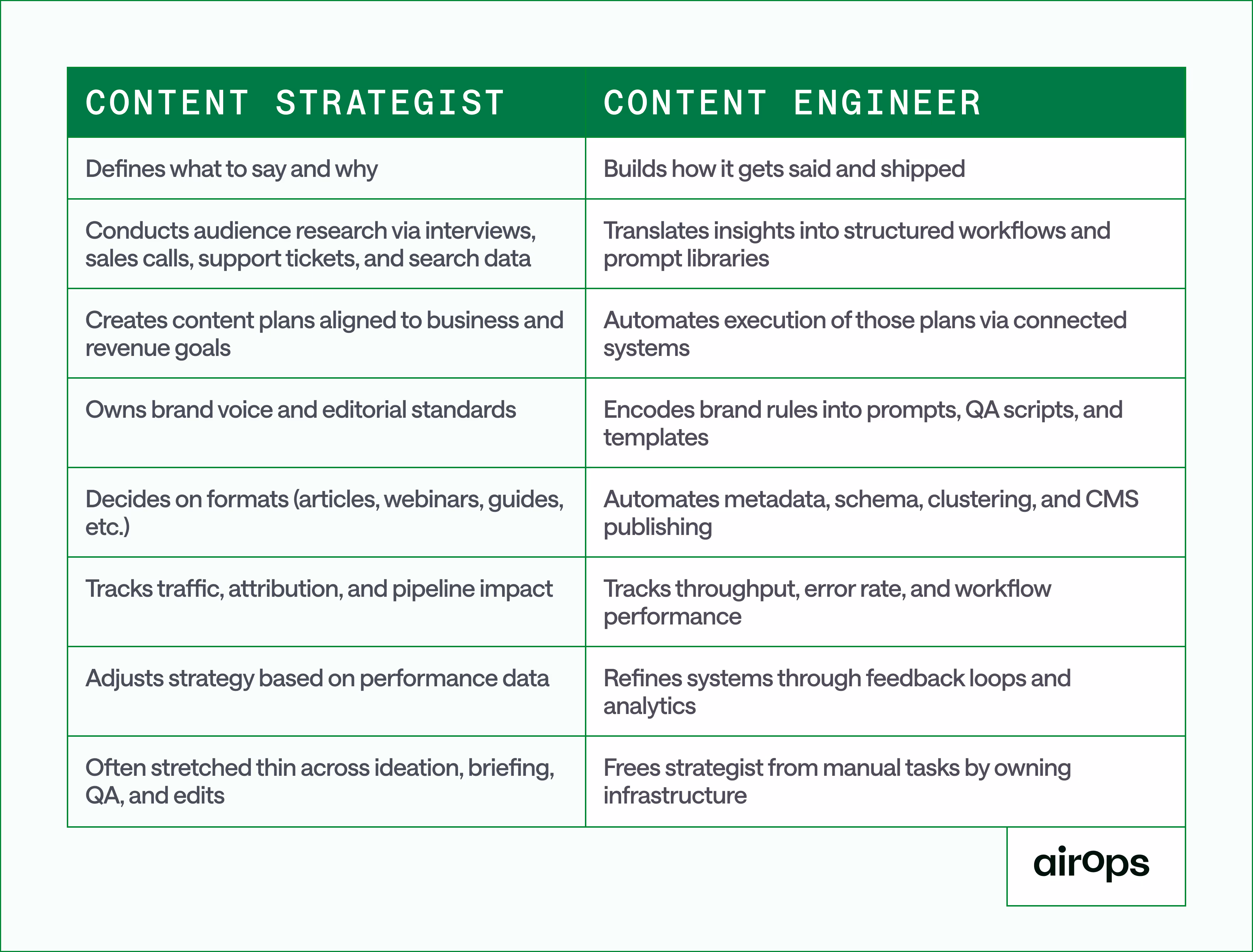 In practice, a strategist can define priorities for the quarter. A content engineer can build the system that ships and improves the work across the entire library.