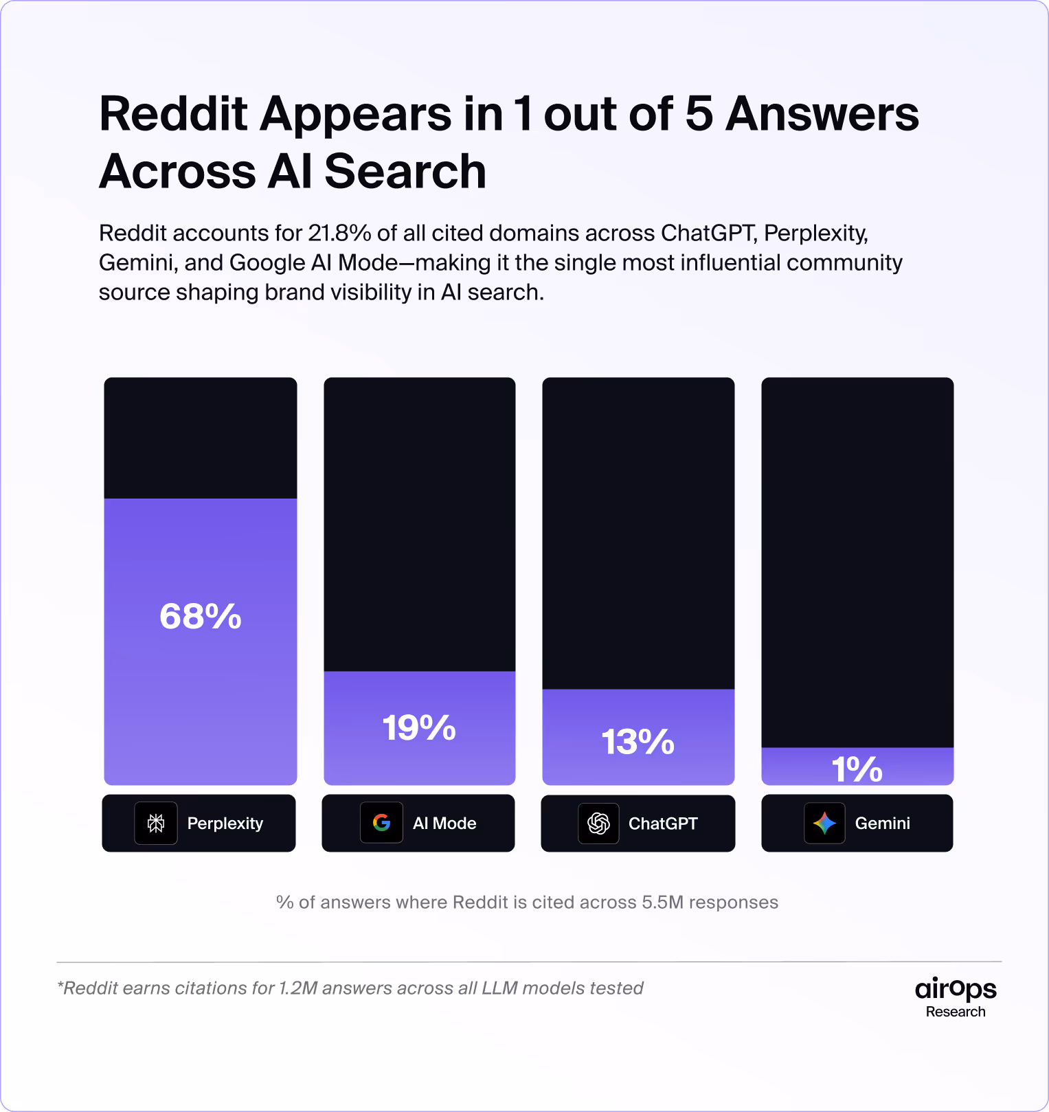 Reddit became a top training and citation source, and AirOps research found that roughly 48% percent of AI answers are influenced by UGC and community platforms. Community platforms shaped how models interpreted categories, which products to compare and which brands to trust.