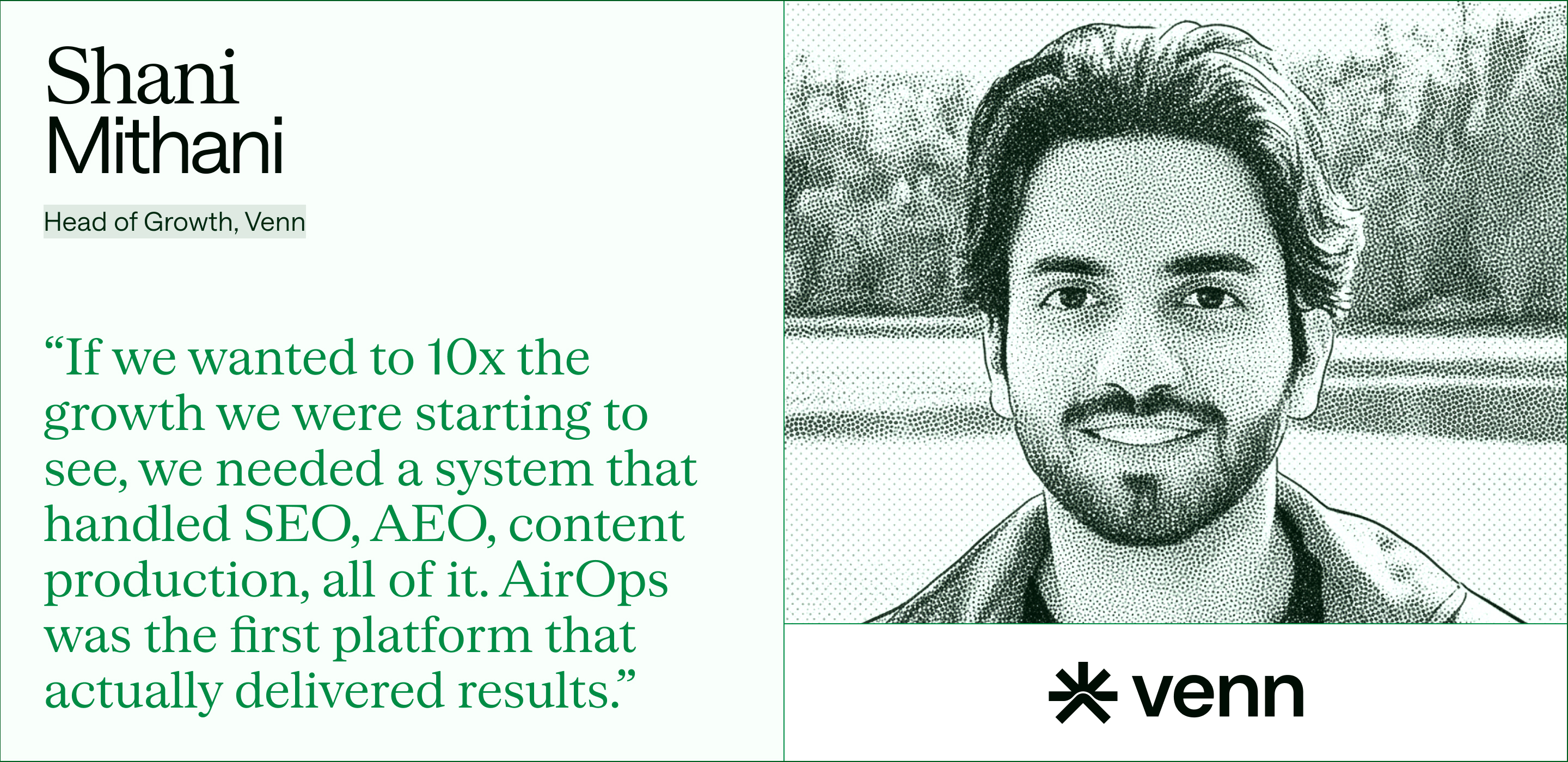 As Shani Mithani, Head of Growth at Venn, puts it: “About a year ago we had just rebranded and were starting from zero. Our new site had no traffic, SEO & AEO was completely new, we had no way of tracking visibility, and agencies were taking too long to ship unoptimized content. We shifted to creating content ourselves and realized good content had many elements beyond the words. If we wanted to 10x the growth we were starting to see, we needed a system that handled SEO, AEO, content production, all of it. AirOps was the first platform that actually delivered results.”