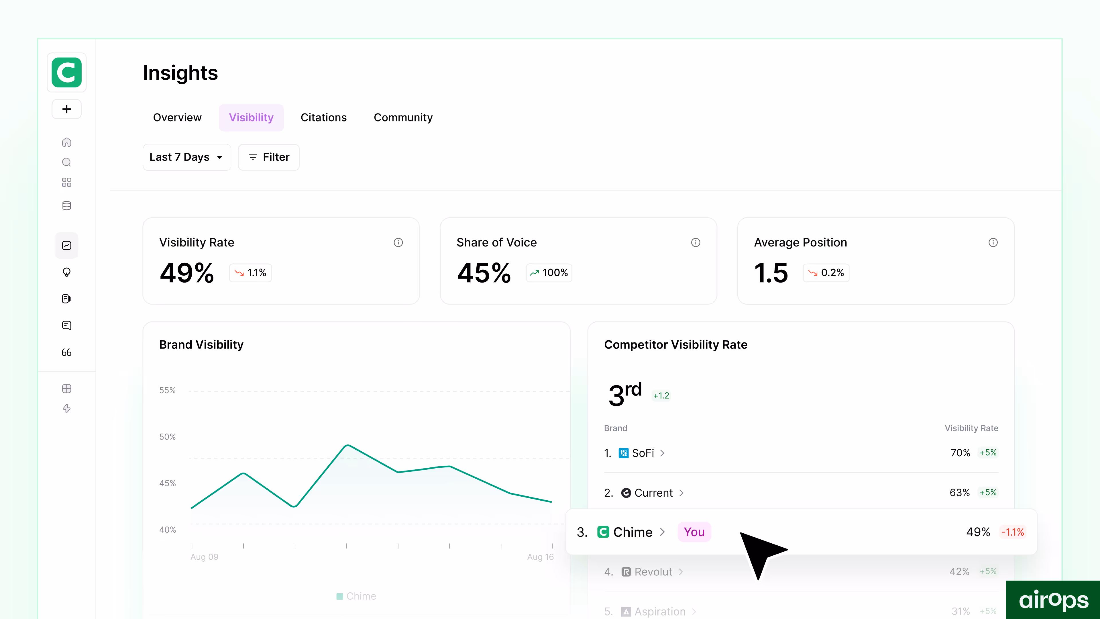 - Share of Voice: How your visibility compares to competitors across AI search.