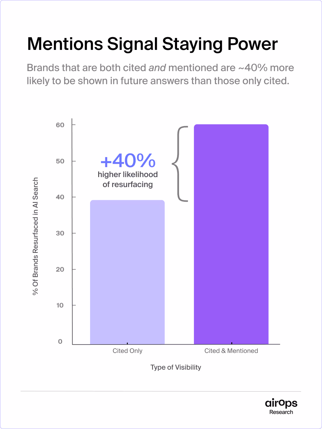 When we widened the scope to non-consecutive runs, we found that ~57% of brands that were both cited and mentioned resurfaced at least twice, while citation-only brands had lower rates of resurfacing.