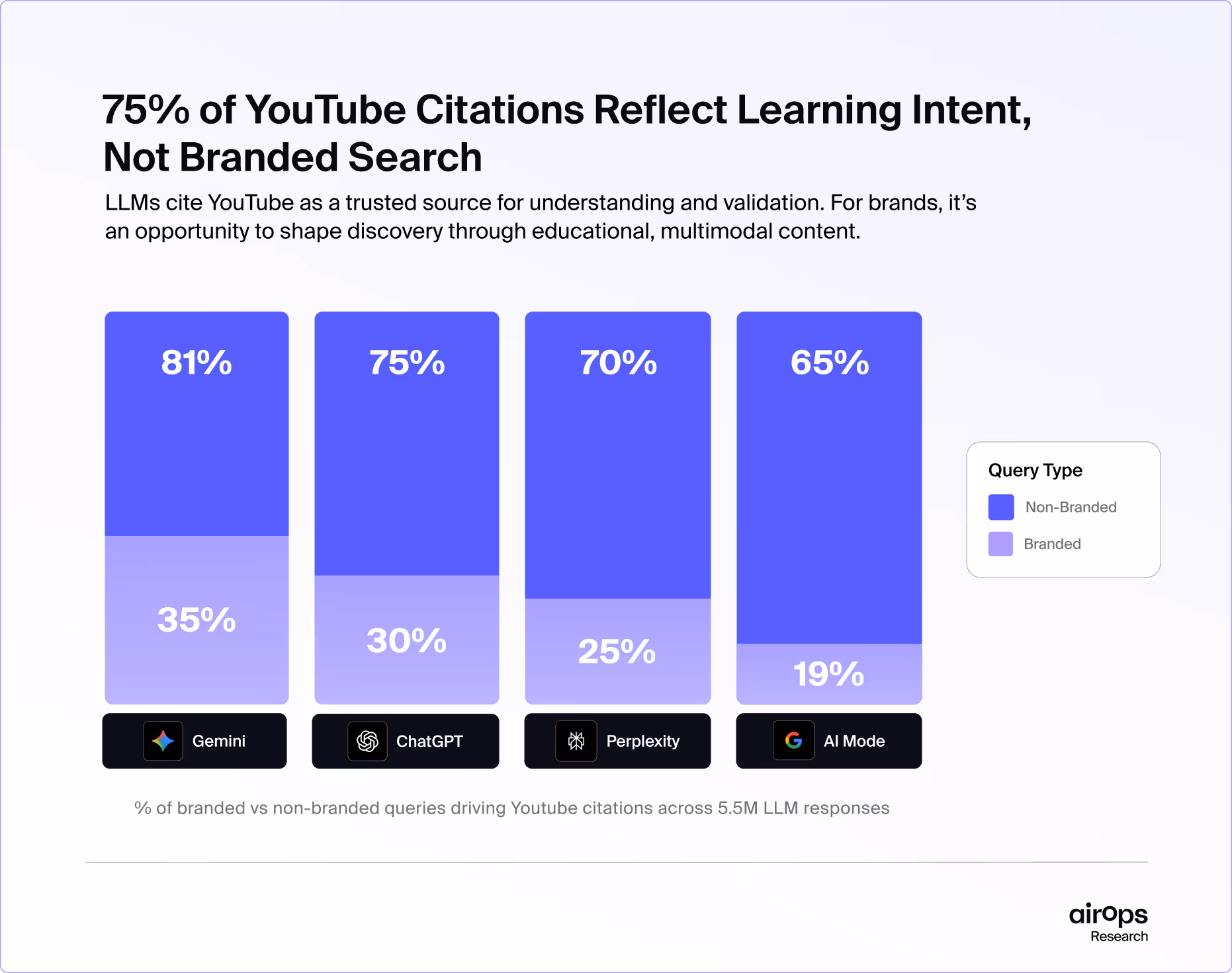 Our research found that 75% of YouTube citations come from non-branded queries, where users are seeking to learn, not to purchase. Models surface YouTube content to explain how something works, which means that educational, transparent videos carry more weight than promotional or brand-led assets.