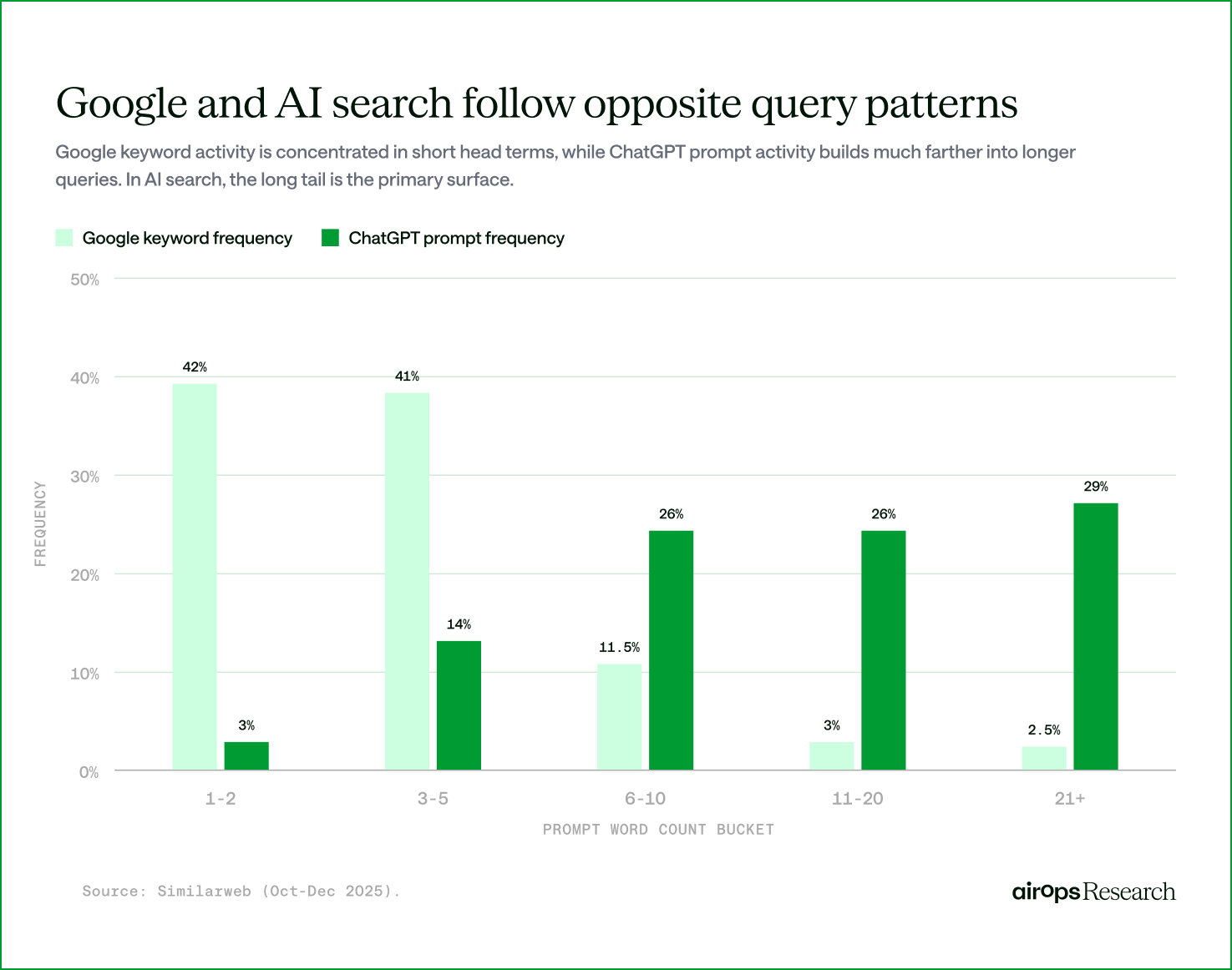 The long tail is not just about longer prompts. It also reflects a broader mix of user intent, with people using AI search in ways that extend beyond traditional search behavior.
