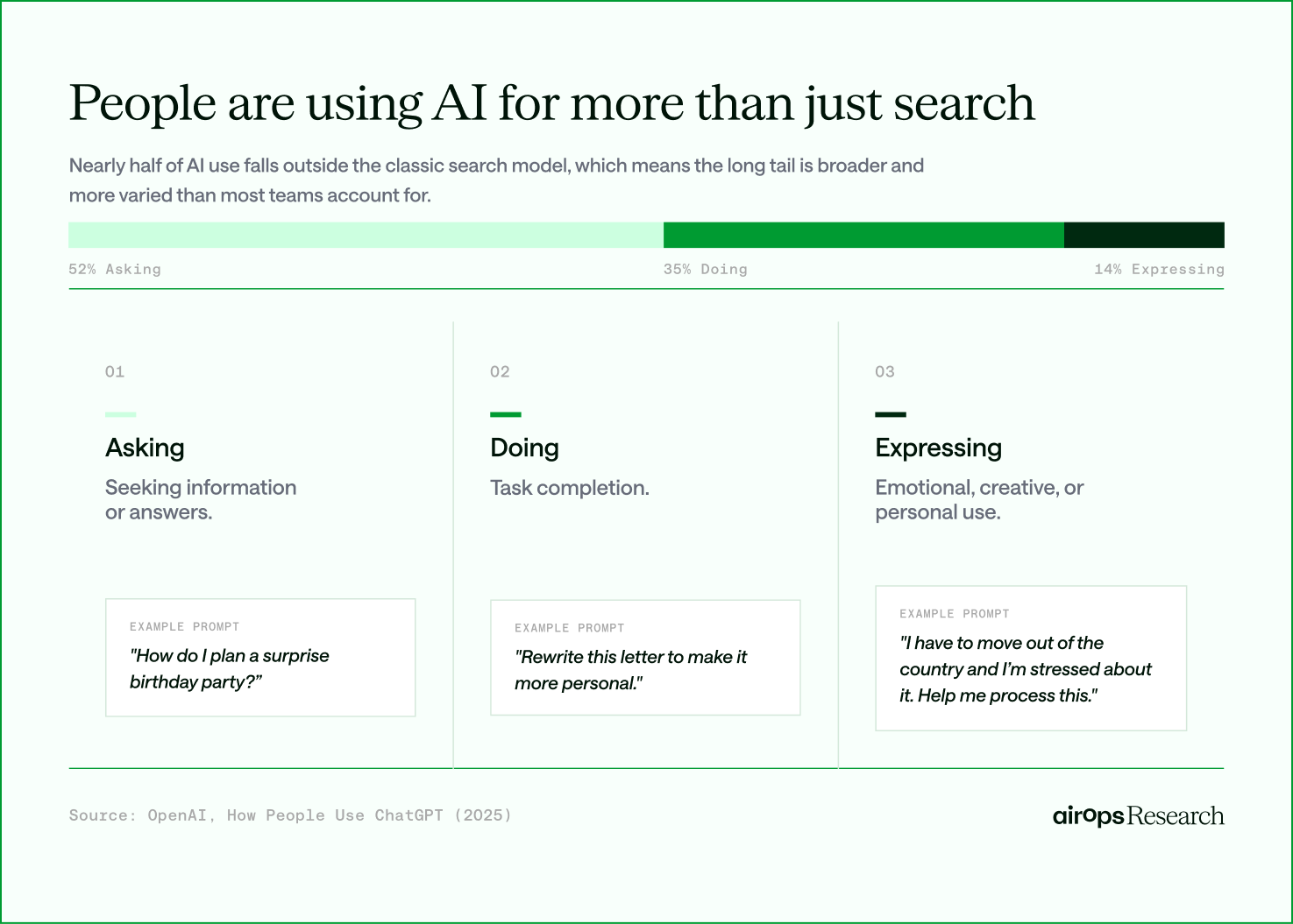 OpenAI Research found that monthly AI sessions break down into 52% Asking, 35% Doing, and 14% Expressing. In other words, nearly half of the ways people use AI search fall outside the classic search model. The long tail is not only bigger than most teams think, it is also more varied.