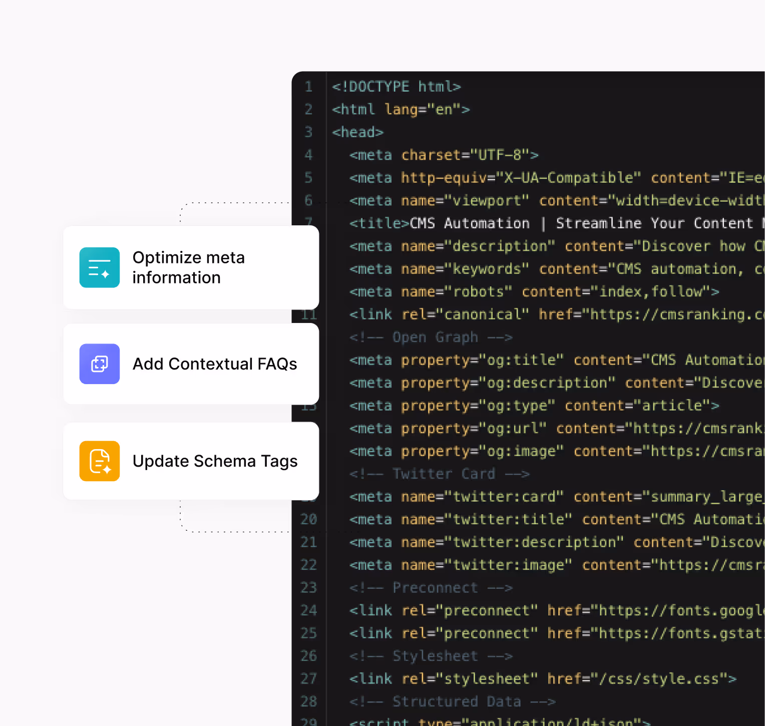 Boost rankings with correct snippets, keywords, page structure, and competitive positioning.