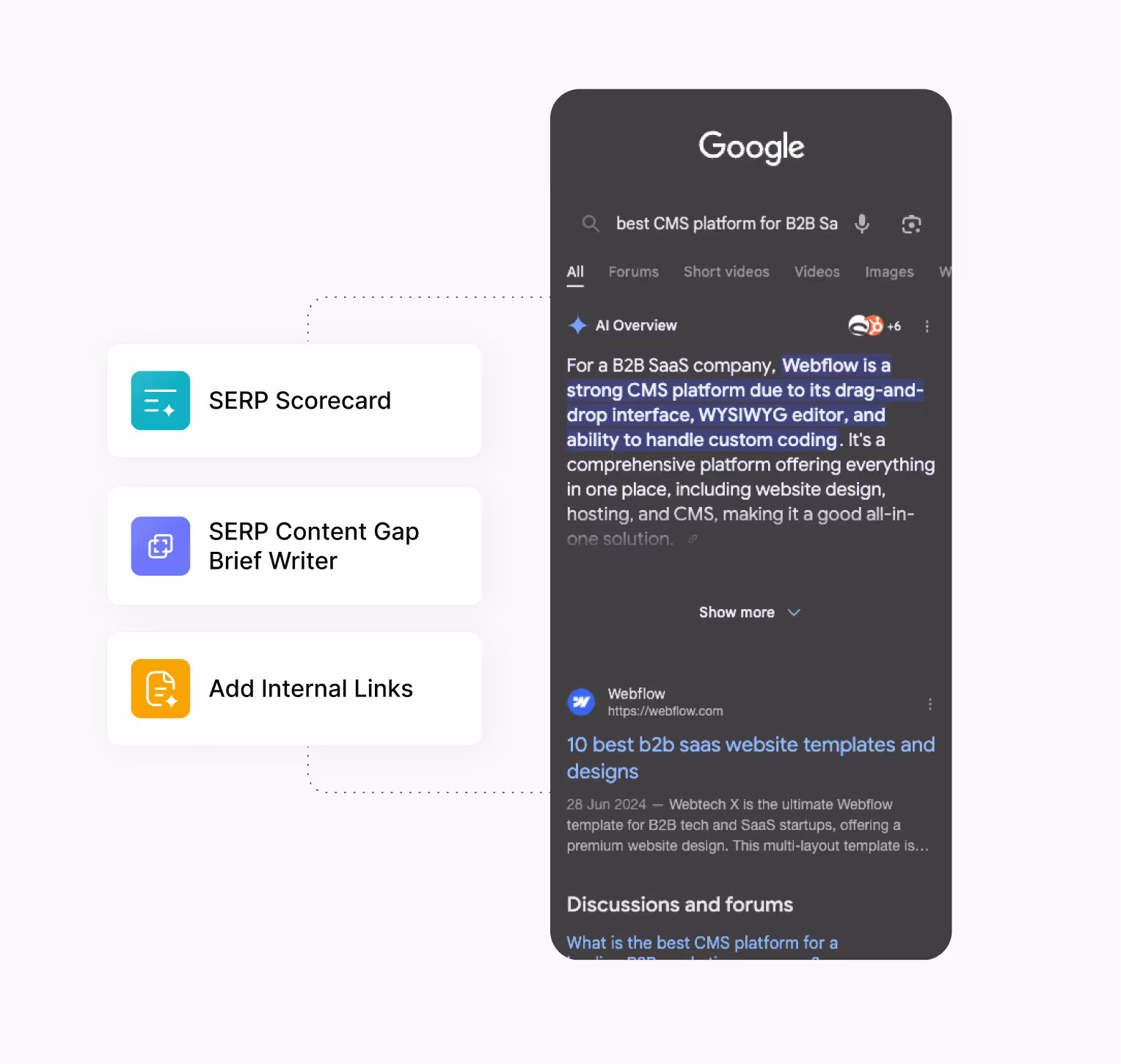 Citations. Dominate Rankings. Stay Brand-Accurate.Create content that’s optimized to win and see results like Webflow’s 40% increase in traffic.